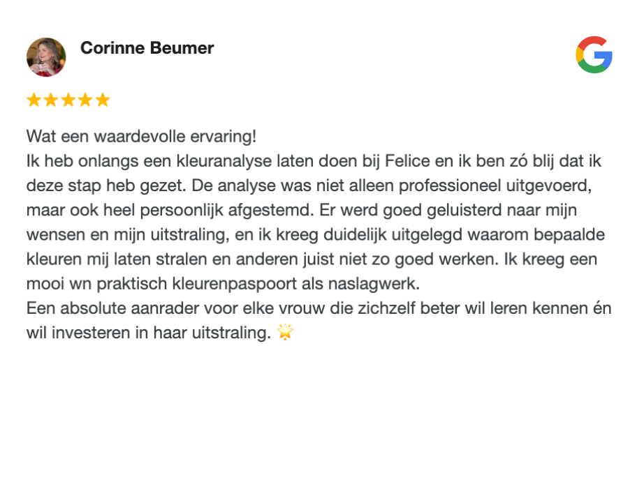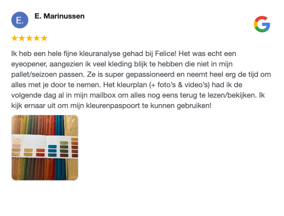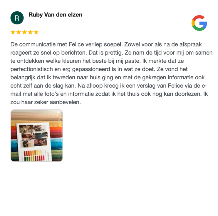 Door de juiste kleuren voel jij je meer jezelf en straal je. Ik zorg ervoor dat de kleuren in het advies niet alleen passen bij jouw uiterlijk, maar ook bij jouw persoonlijkheid. Zodat de kleuren altijd voelen als helemaal jou! Dit geeft jouw zelfvertrouwen een enorme boost.